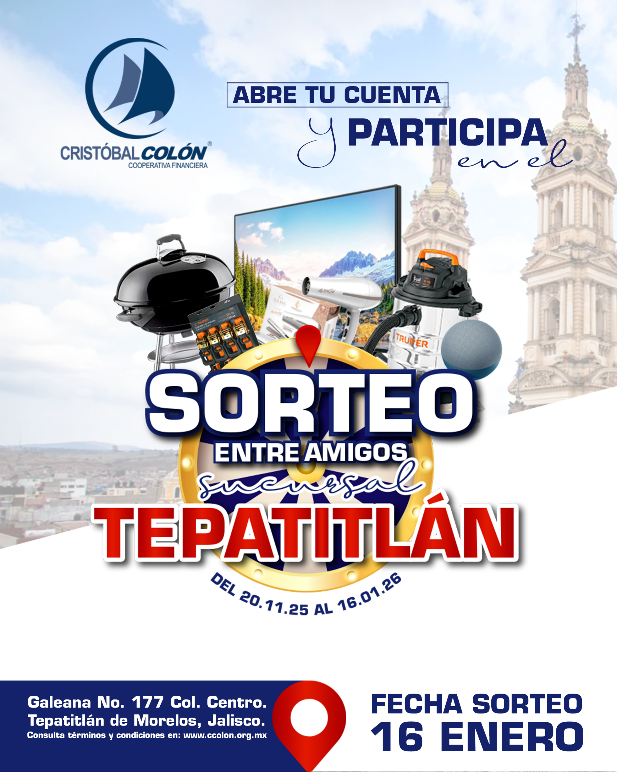 El sábado 17 de enero de 2026, siguiente día natural a la realización del sorteo, se publicarán los resultados de los ganadores en las instalaciones de la sucursal Tepatitlán; en nuestras redes sociales https://www.facebook.com/CajaPopularCristobalColon, https://www.instagram.com/cristobalcolon.cooperativa/, así como en nuestra página de internet www.ccolon.org.mx, donde pueden consultar nuestro aviso de privacidad.